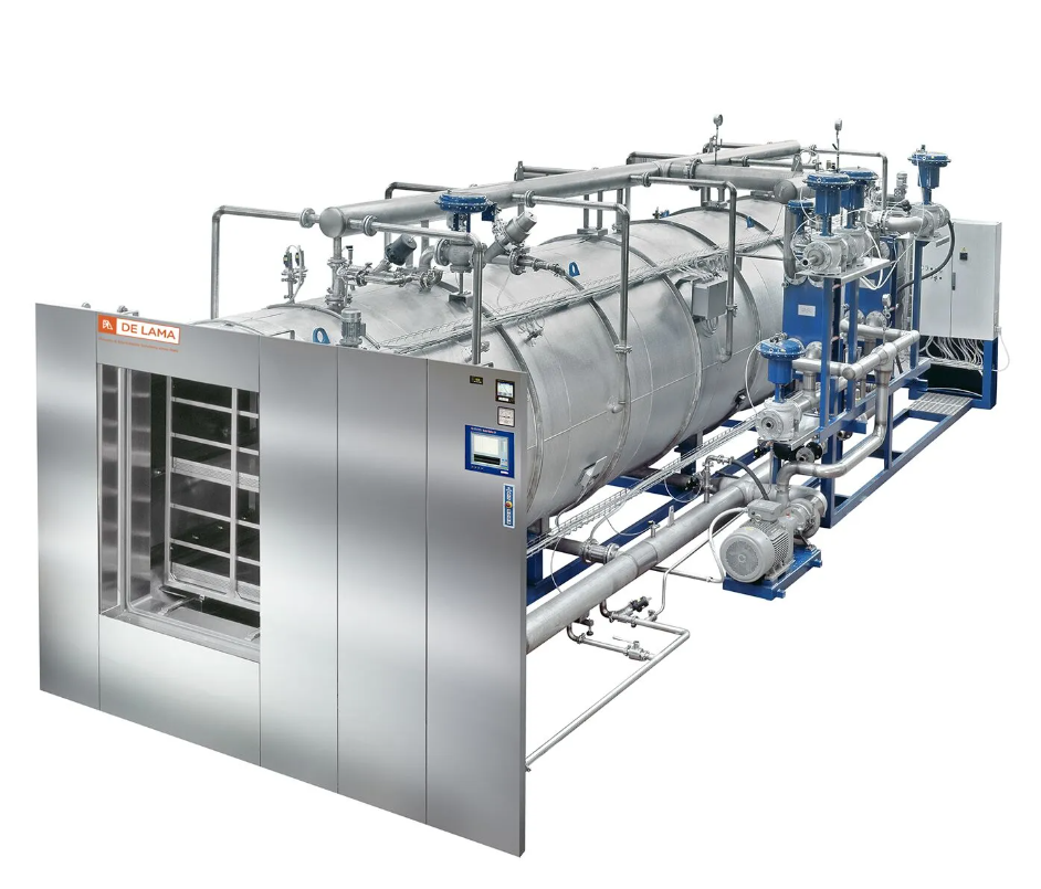 De Lama superheated water circulation sterilizers, with spray distribution system, DLOS series, are specially designed to perform sterilization treatment of large volume infusion/parenteral solutions packed both in non-deformable containers (e.g. glass bottles) as well as in deformable containers (e.g. plastic bottles, plastic bags) able to withstand sterilization conditions by hot water spray.
